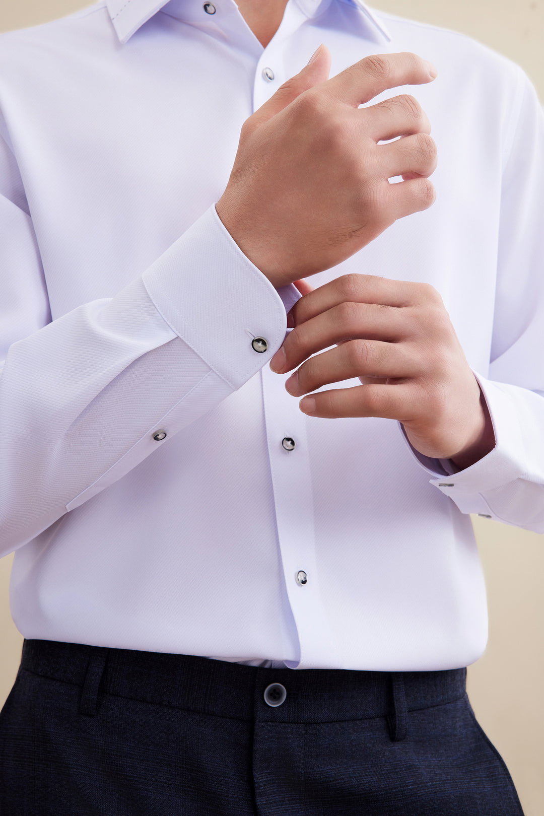 Non-Iron免熨防皺技術處理 | 可機洗 | Dry速乾 | Anti-Static防靜電功能 | 寬角領 | 配衣領撐 | 圓形袖 | 前襟正面設計 | 一體式合縫