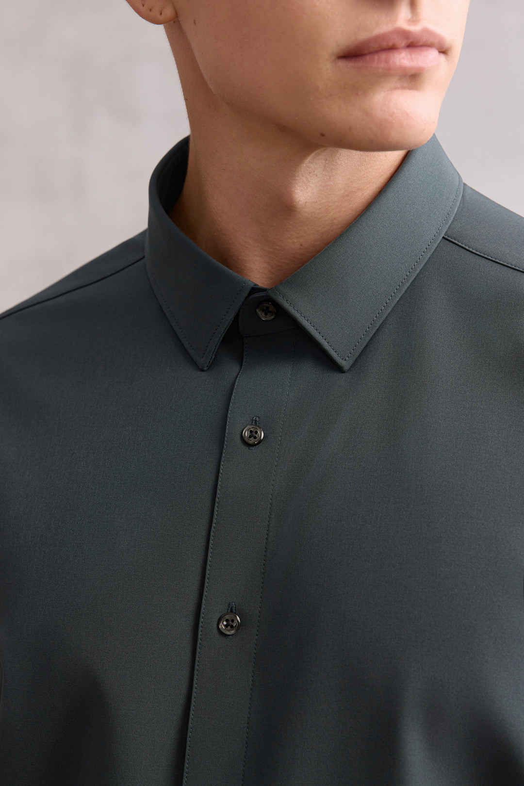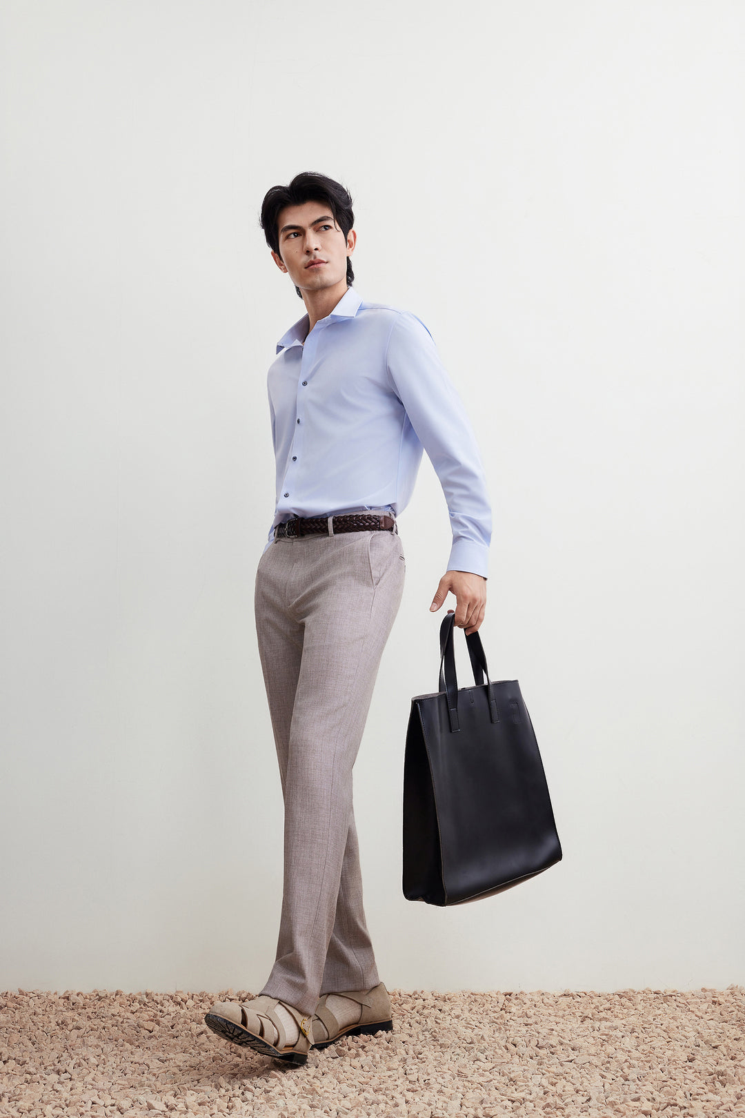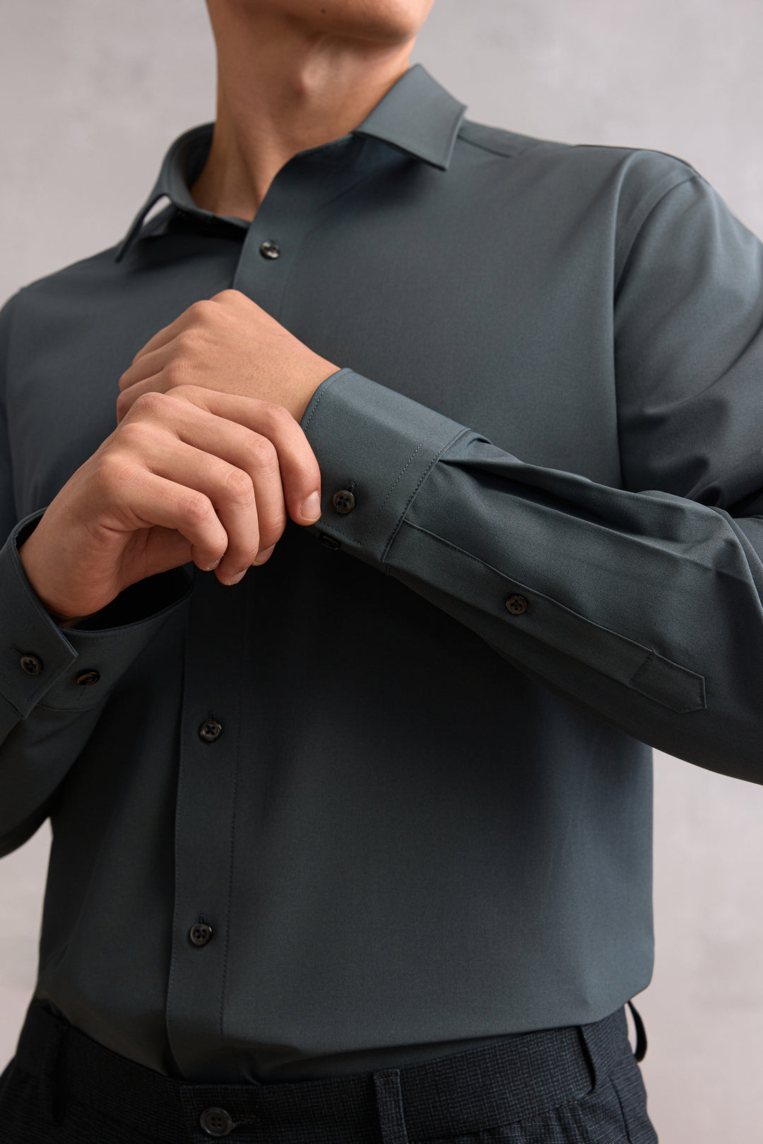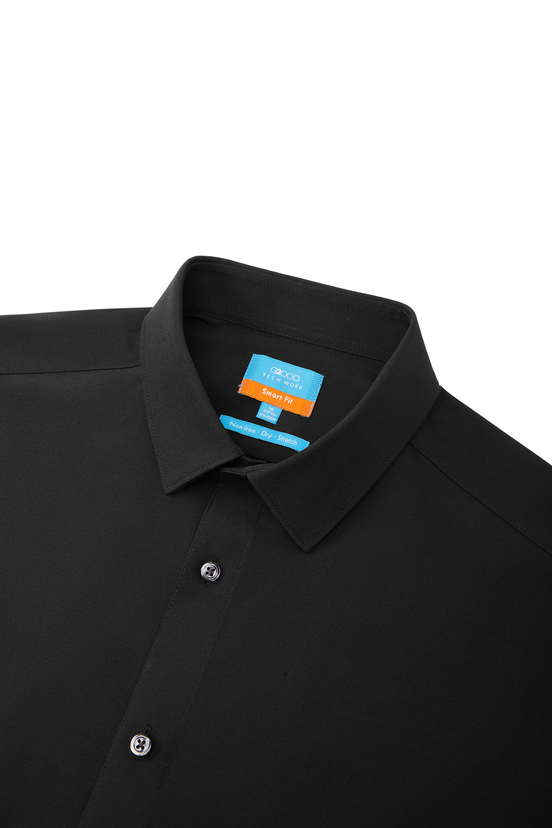Non-Iron免熨防皺技術處理 | 可機洗 | Dry速乾 | Multi-Way Stretch多面彈性 | Anti-Static防靜電功能 | 窄領 | 配衣領撐 | 圓形袖 | 前襟正面設計 | 一體式合縫