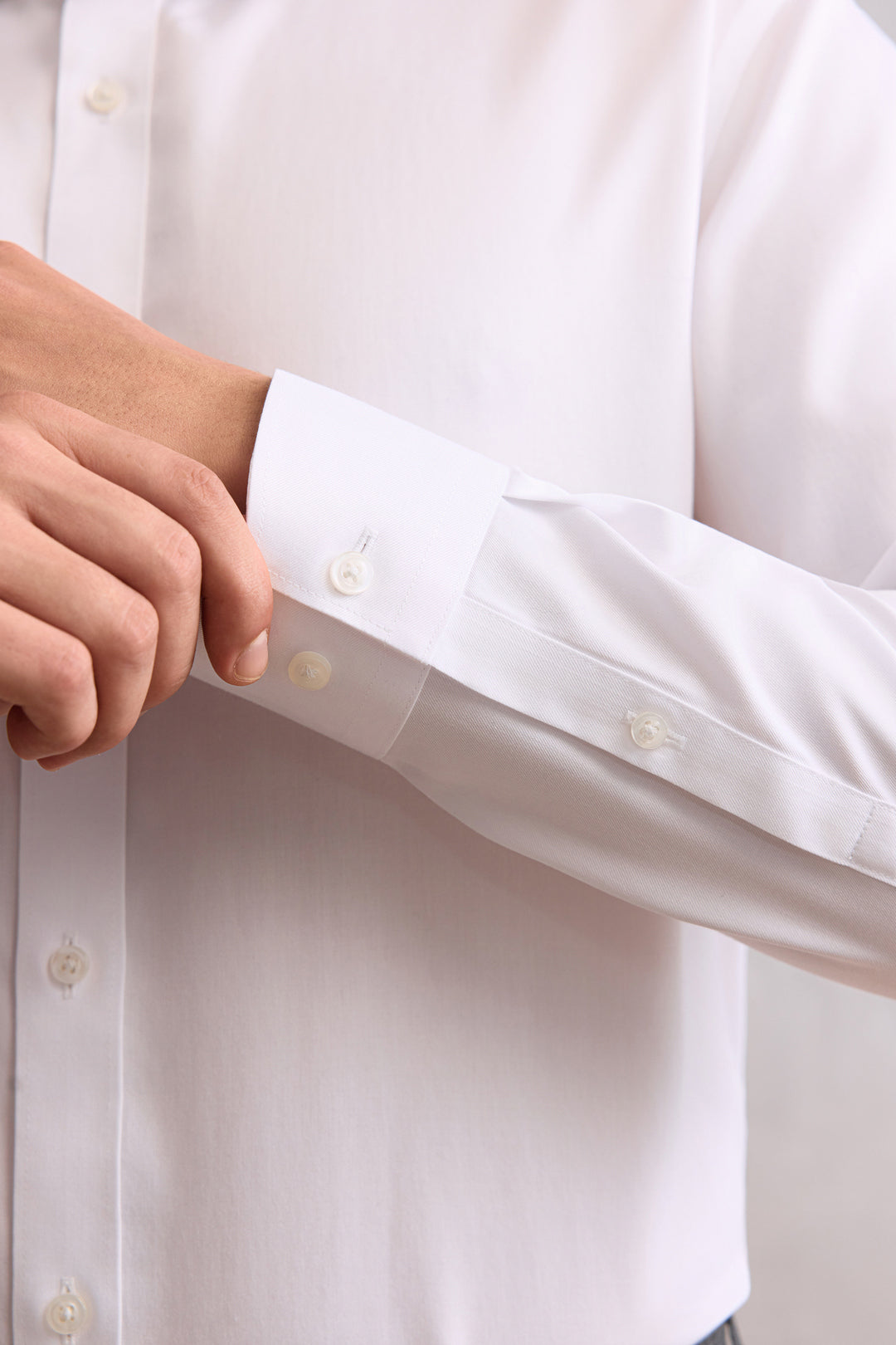 Non-Iron免熨防皺技術處理 | 可機洗 | 寬角領 | 配衣領撐 | 圆形袖 | 前襟正面設計 | 一體式合縫