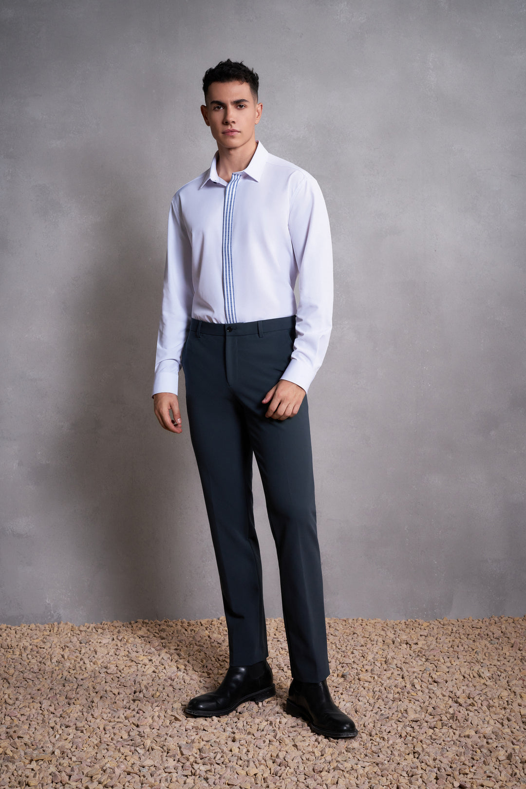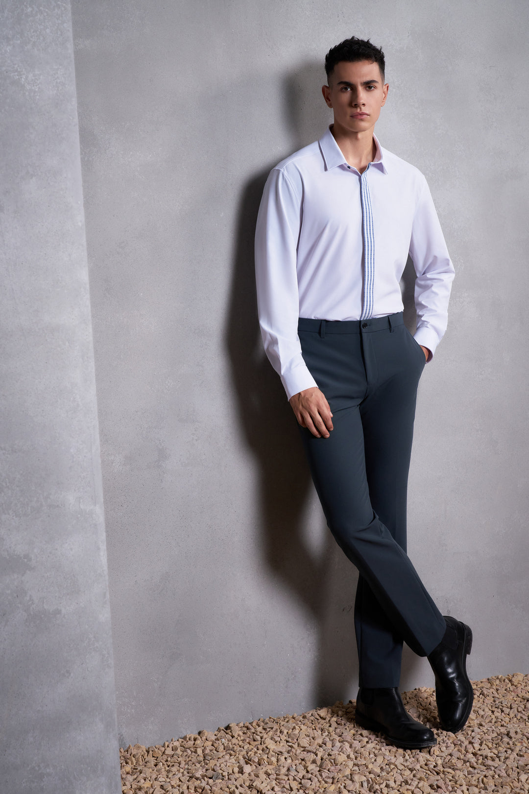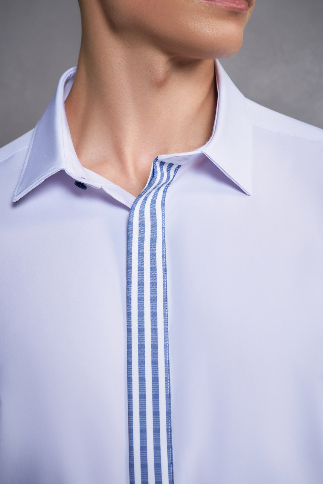 Non-Iron免熨防皺技術處理 | 可機洗 | Dry速乾 | Multi-Way Stretch多面彈性 | Anti-Static防靜電功能 | 窄領 | 配衣領撐 | 斜角袖 | 暗門襟正面設計 | 一體式合縫