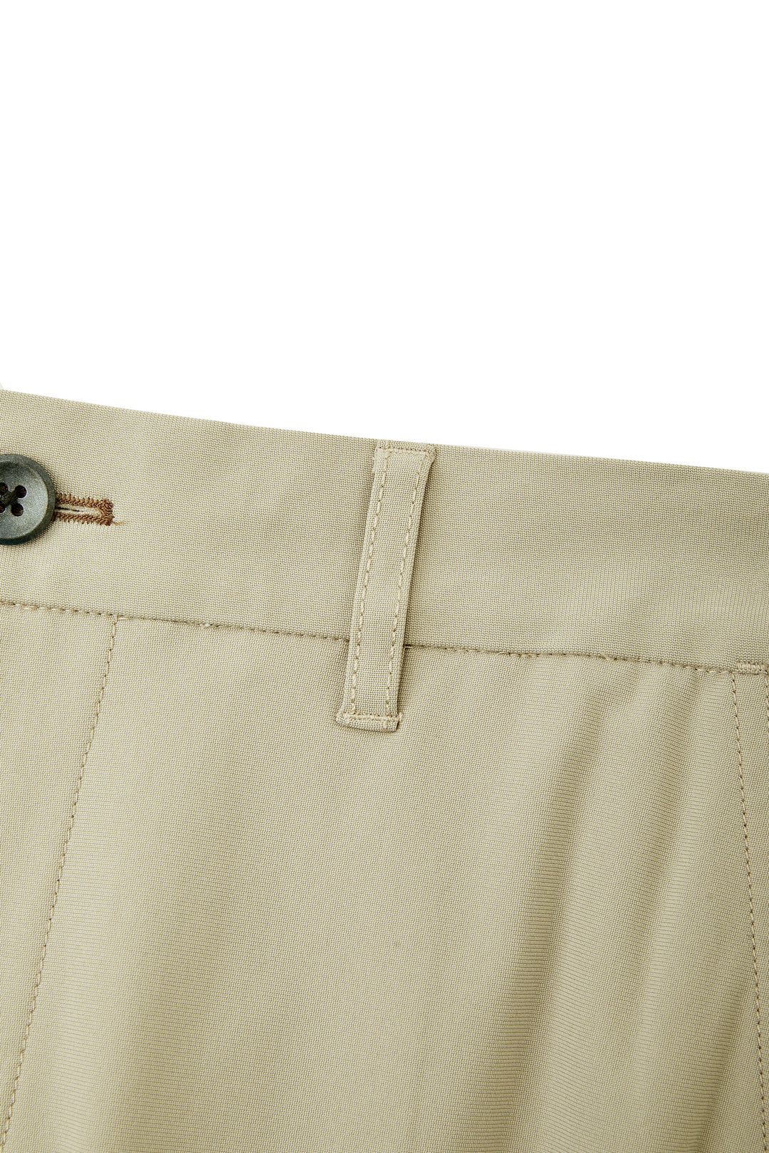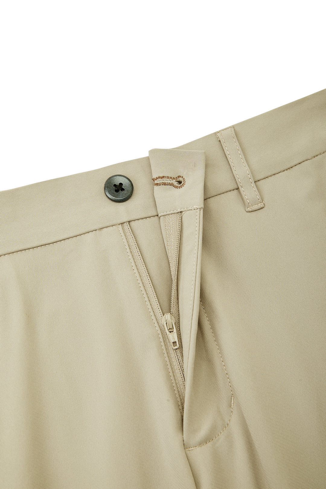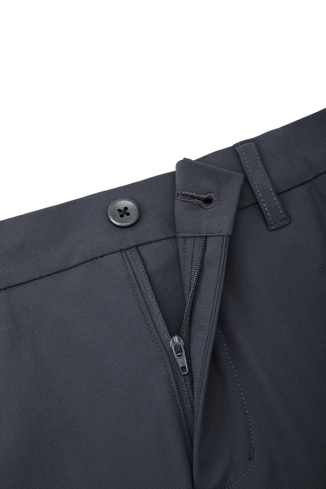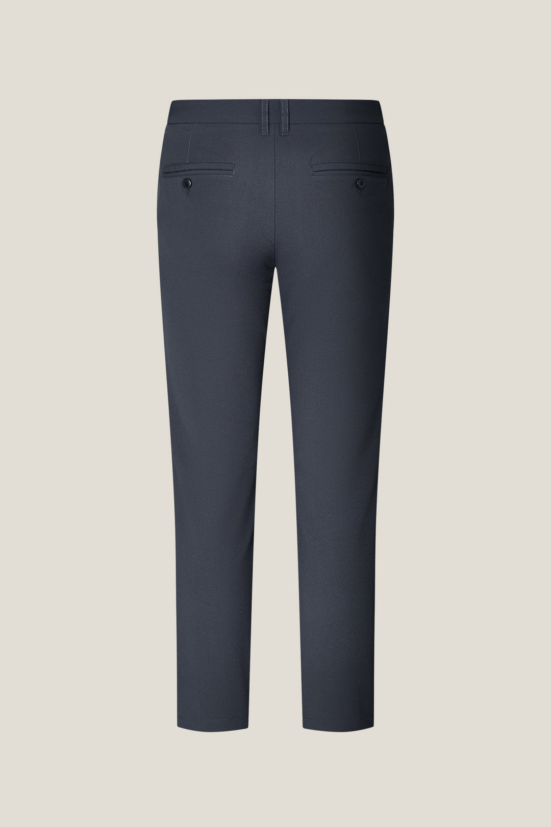 可機洗 | 彈性腰頭 | 平腳無褶 | 固定式腰頭設計 | 附褲頭圈 | 鈕扣配拉鍊門襟 | 斜插袋 | 雙嵌線後袋 | 附鈕扣